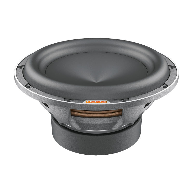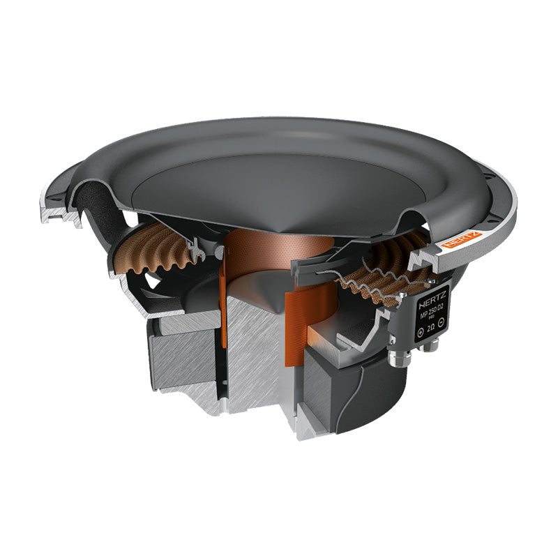 Outstanding performance in a compact size, this is the target of Mille Pro car audio subwoofers. On the strength of its know-how acquired with Mille Legend, the R&D team has optimized the production process to offer the “Hertz Sound Experience” to a wider audience using part of the technologies and materials of the flagship line. The MP 250 D4.3 cone is made by pressing paper pulp with the injection of mineral powders, the same construction technique used for Legend. The V-cone® profile increases rigidity, allowing the cone to function like a piston. Surround materials consist of high-purity IIR-butyl rubber. Like the Legend ML2000.3 and ML2500.3, the Mille PRO subwoofers are built with Boundary Free Surround technology allowing for a greater emission surface with equal diameter, generating higher sound pressure. The compact 6-spoke aluminum alloy anti-resonant basket is the same as the top model ML 2500.3 and contributes to the subwoofer’s mechanical damping, being absolutely transparent to the sound. The 65-mm 4-layer voice coil is higher than 60 mm and wound in a TIL-P former, thus delivering high linear displacement. The 4 Ω + 4 Ω DVC impedance configuration improves versatility to match any amplifier system. The air cooling and decompression system avoids the need for a centre hole on the bottom plate with three advantages: