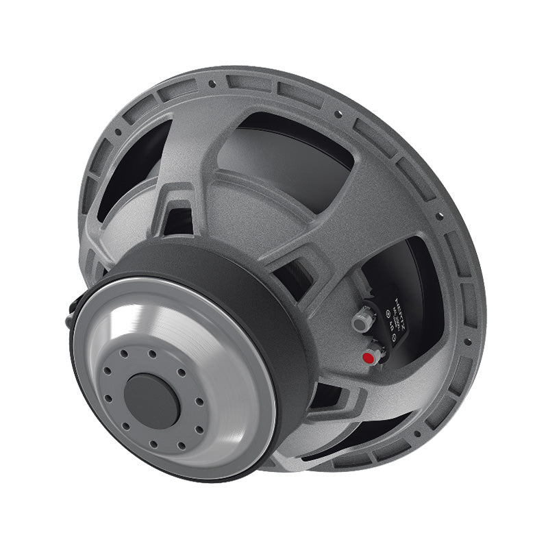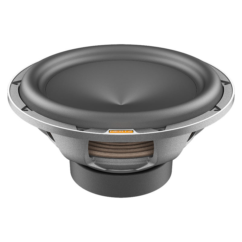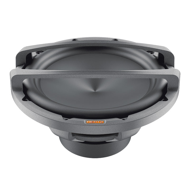 Outstanding performance in a compact size, this is the target of Mille Pro car audio subwoofers. On the strength of its know-how acquired with Mille Legend, the R&D team has optimized the production process to offer the “Hertz Sound Experience” to a wider audience using part of the technologies and materials of the flagship line. The MP 300 D4.3 cone is made by pressing paper pulp with the injection of mineral powders, the same construction technique used for Legend. The V-cone® profile increases rigidity, allowing the cone to function like a piston. Surround materials consist of high-purity IIR-butyl rubber. Like the Legend ML2000.3 and ML2500.3, the Mille PRO subwoofers are built with Boundary Free Surround technology allowing for a greater emission surface with equal diameter, generating higher sound pressure. The compact 6-spoke aluminum alloy anti-resonant basket is the same as the top model ML 2500.3 and contributes to the subwoofer’s mechanical damping, being absolutely transparent to the sound. The 65-mm 4-layer voice coil is higher than 60 mm and wound in a TIL-P former, thus delivering high linear displacement. The 4 Ω + 4 Ω DVC impedance configuration improves versatility to match any amplifier system. The air cooling and decompression system avoids the need for a centre hole on the bottom plate with three advantages: