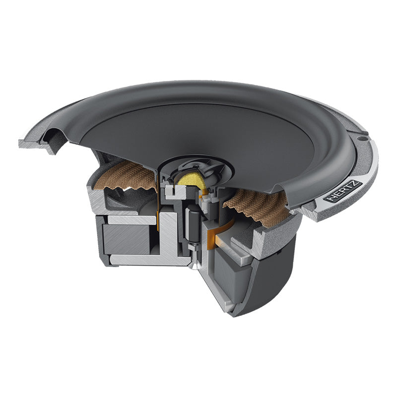 The  coax tweeter concentric to the woofer of the MPX 165.3 car audio coaxial speakers  allows for one single linear-phase emission point, for a natural timbre providing a detailed sound stage. Thanks to the “Center Tuning Duct” geometry, the tweeter resonance frequency is especially low and the employment of damping materials for the inside provides for a linear acoustic emission. The acoustic lens optimizes its off-axis response, which is typical with door installation of coax speakers; besides, the 36 mm diameter woofer generates deep and controlled bass frequencies.