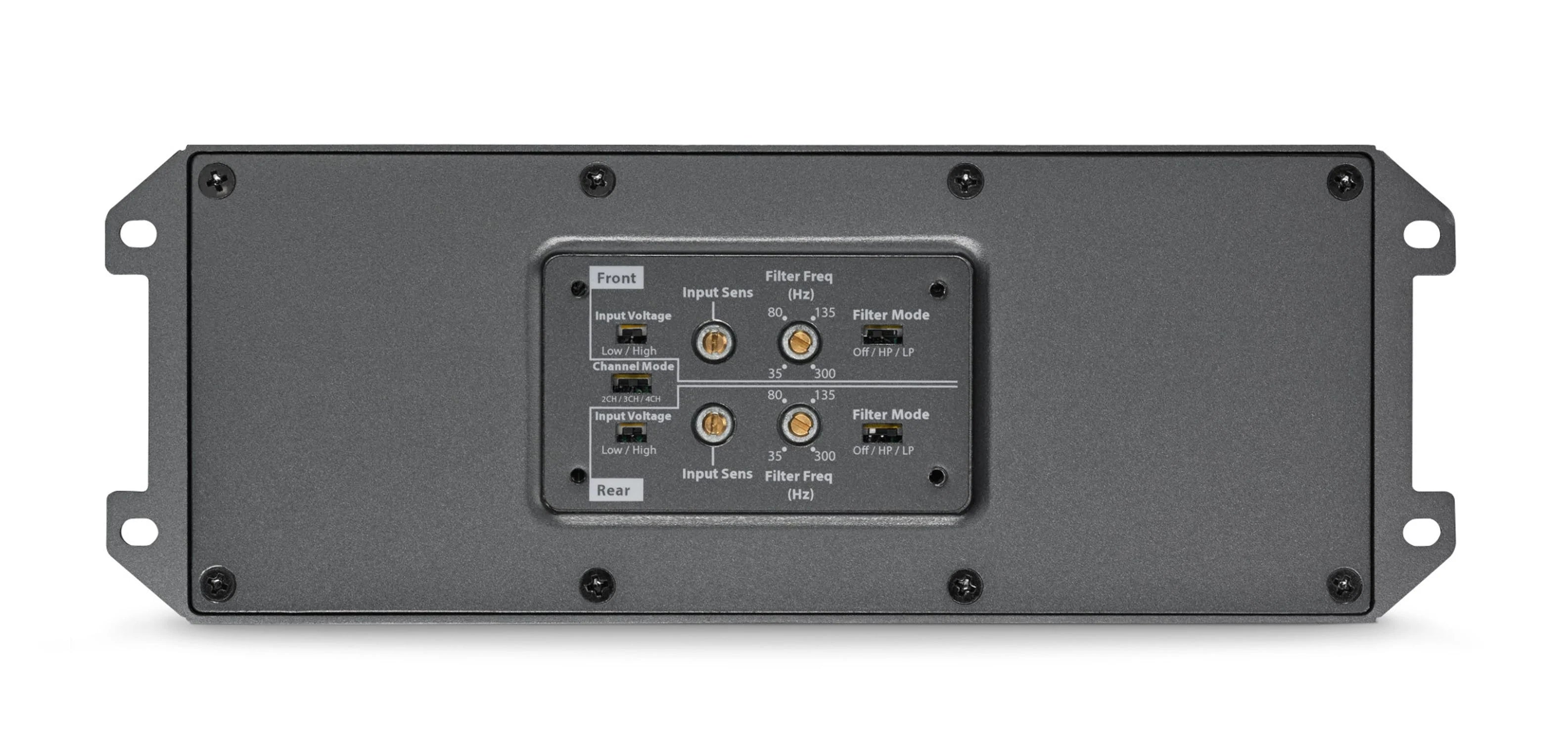 • Other features include independent front and rear crossovers with selectable full-range, high-pass or low-pass filter controls and a dual-range input section that accepts a wide range of input voltage levels, from line-level all the way to high-power speaker level signals.