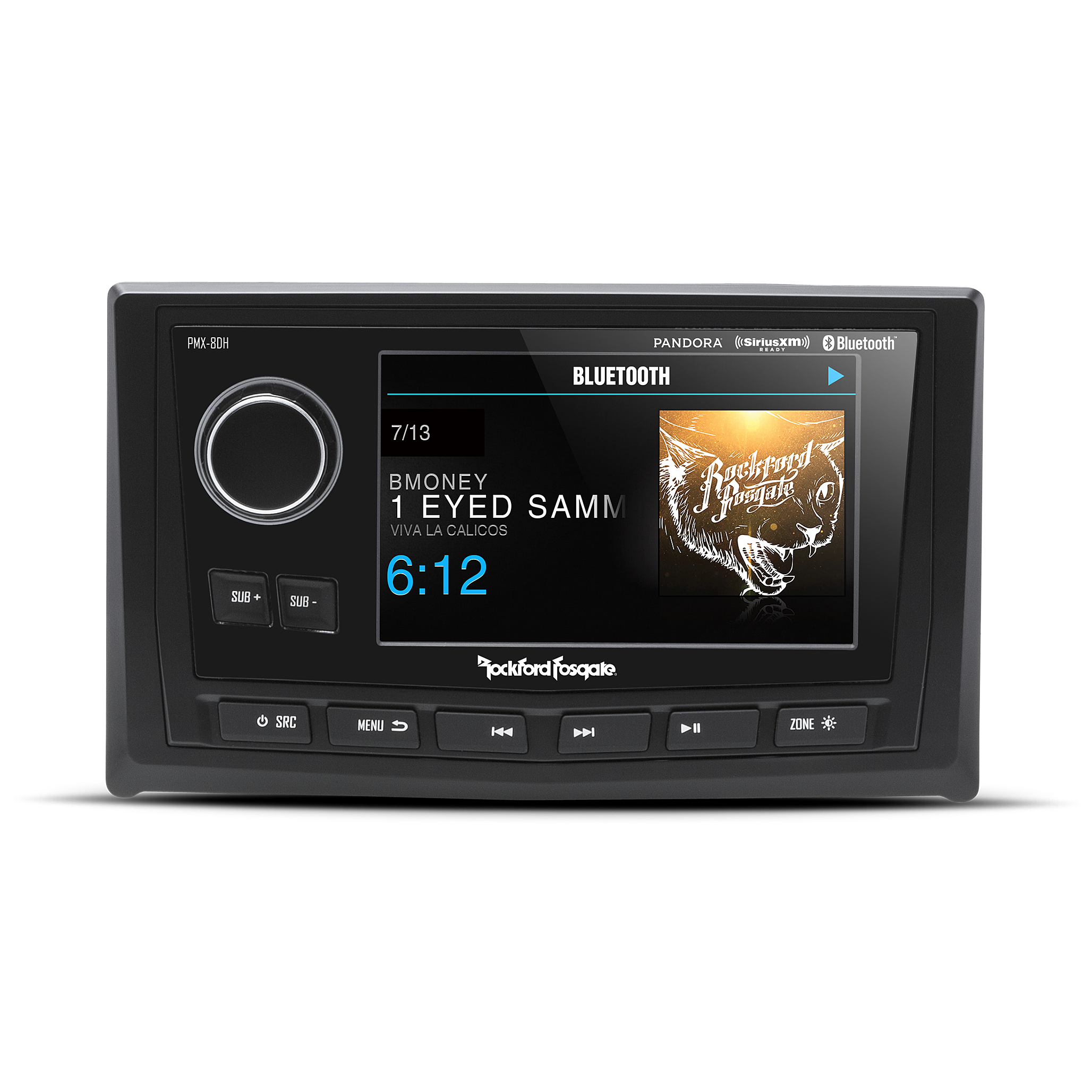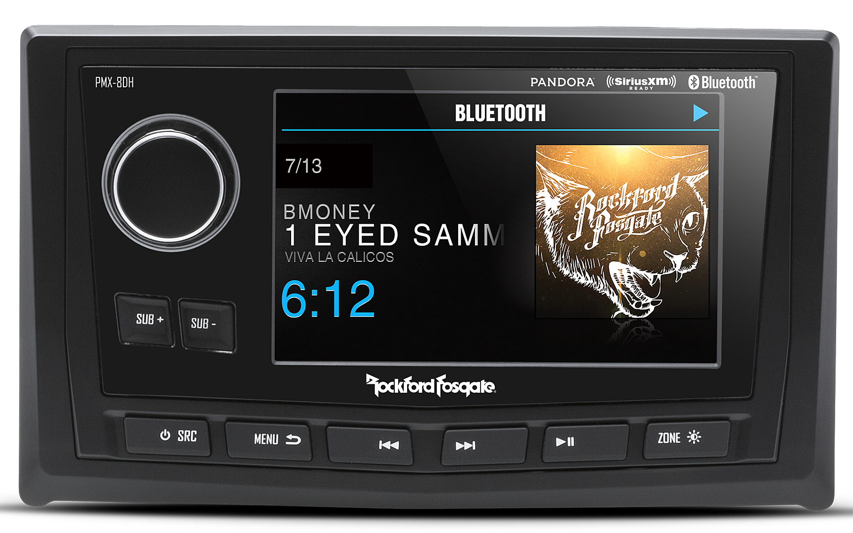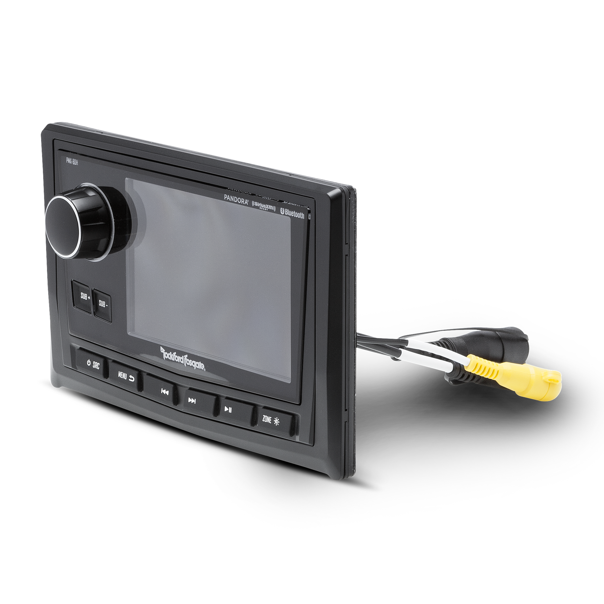 The PMX-8DH, used with the PMX-8BB hide away media receiver is a wired display head controller giving you access to all the receivers capabilities. It features a 5" ultra bright color TFT display for optimum viewing even in full sun that is optically wet bonded to prevent any dust or moisture penetration. It is IPX6 rated and uses a water resistant rotary encoder knob with white LED button illumination. Additionally it features front panel illumination and sub controls, composite video input as well as a conformal coated PCB for elemental protection.